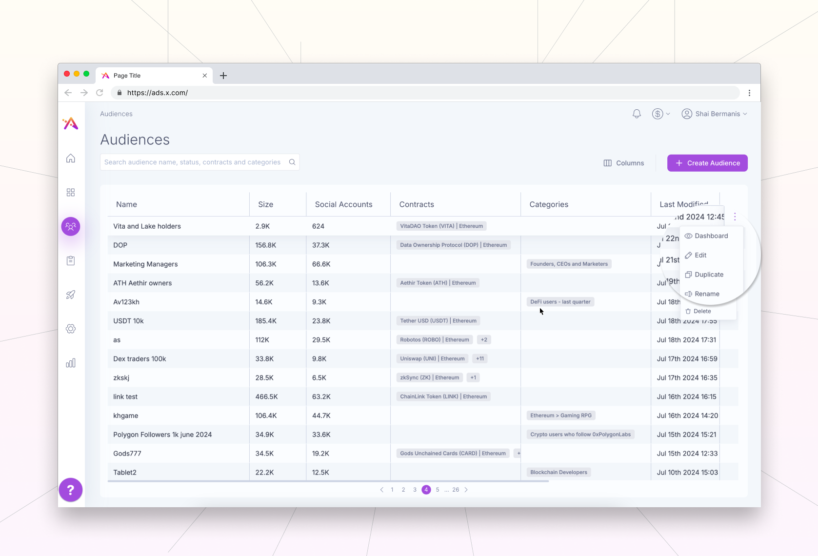 This is an overview of all the audience groups you have created within a single screen. You can search, filter and sort your audiences by name, status and even the contracts the audiences are based on.<br>